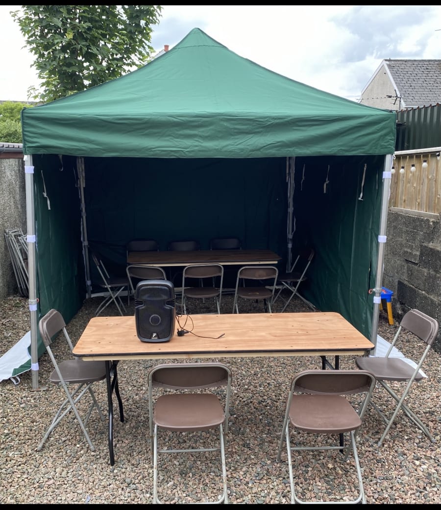 Create the perfect setting for your event with our 10x10ft Gazebos! These canopy-style marquee party tents are ideal for family gatherings, birthday celebrations, and community events. Each gazebo hire includes two tables, ten chairs, a Bluetooth speaker, and a disco light, making it a complete package for your occasion. Available for hire across Coleraine, Portrush, Portstewart, Ballymoney, Limavady, and throughout Northern Ireland, these gazebos provide a stylish and functional solution for your party needs.